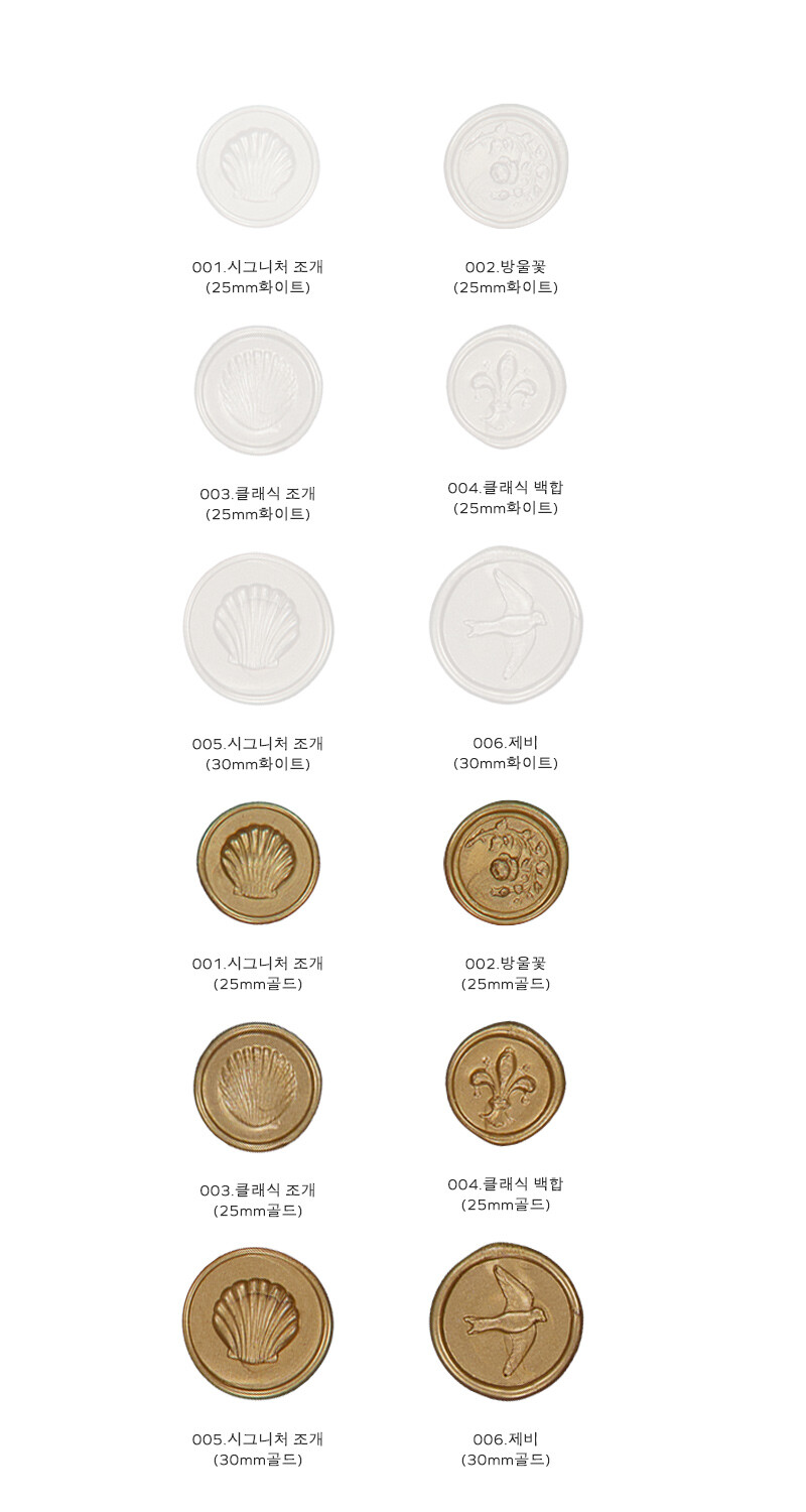 청첩장에 기본 제공되는 왁스 실링 스티커는 25mm 사이즈입니다. 25mm 동일 사이즈로 무료 옵션 변경 가능합니다. 30mm 변경 시 1개당 300원의 추가 비용이 발생됩니다.