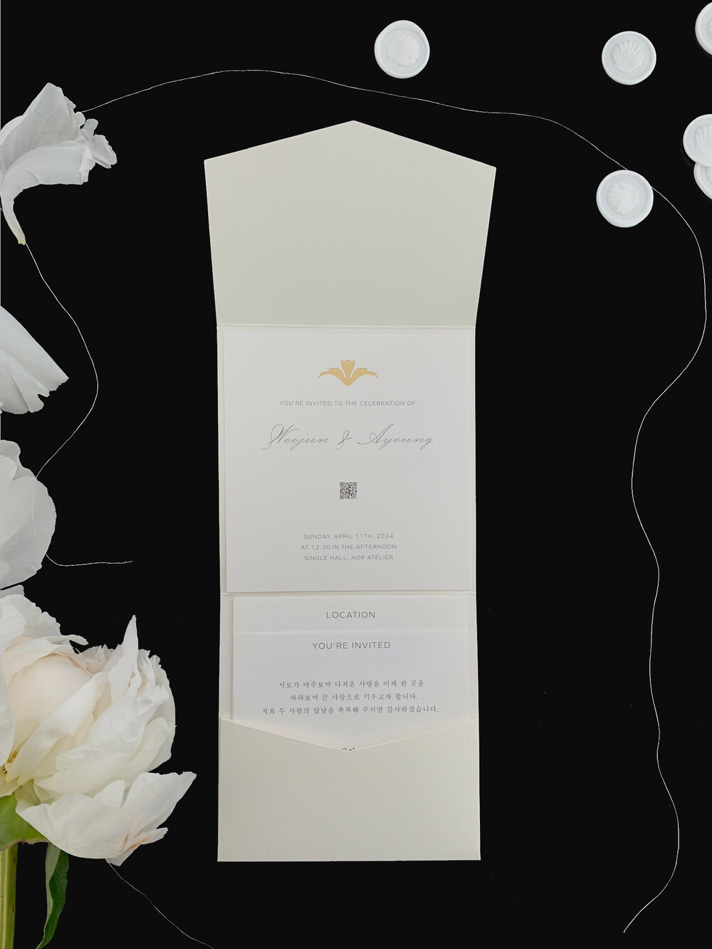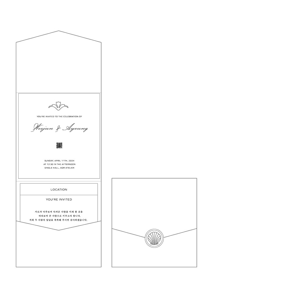 GARDEN WEDDING WHITE 컬렉션은 차분하고 클래식한 화이트 계열의 디자인이 어우러져 따뜻하고 싱그러움이 가득한 특별한 날의 소식을 더욱 소중하게 전달합니다. 트라이폴드 형식의 레이아웃으로 고급스러운 분위기를 연출하며, 실링왁스 디테일 장식을 더해 정성스러운 한편의 편지를 전하는 마음을 느낄 수 있습니다.