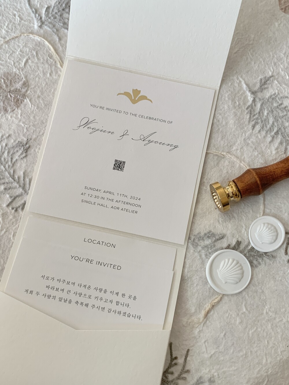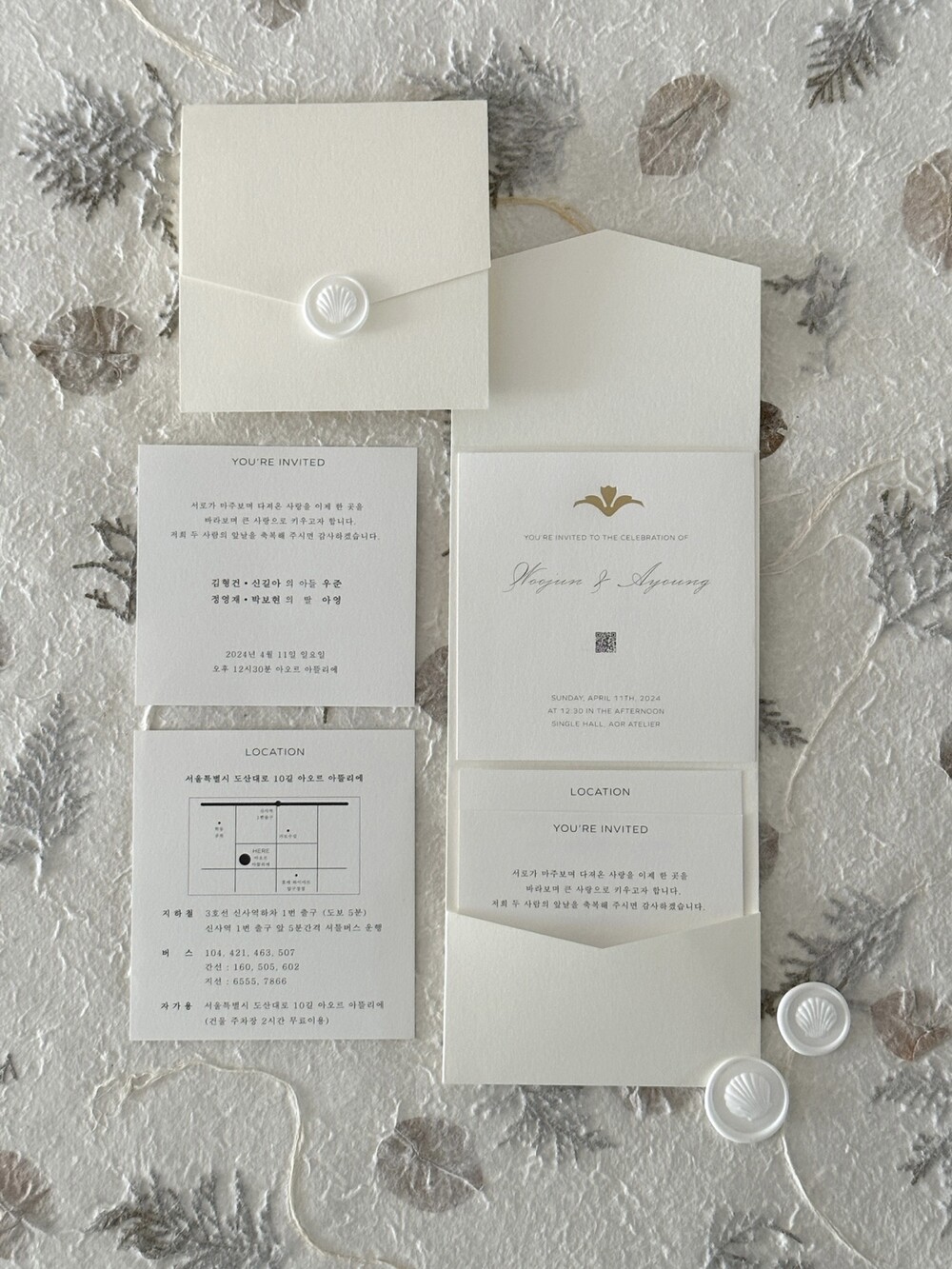 3. 특이사항 : 왁스실링 30mm로 변경 가능하며, 변경 시 추가금액이 발생될 수 있습니다. 트라이폴드 형태의 청첩장으로 별도 봉투는 제공되지 않습니다.