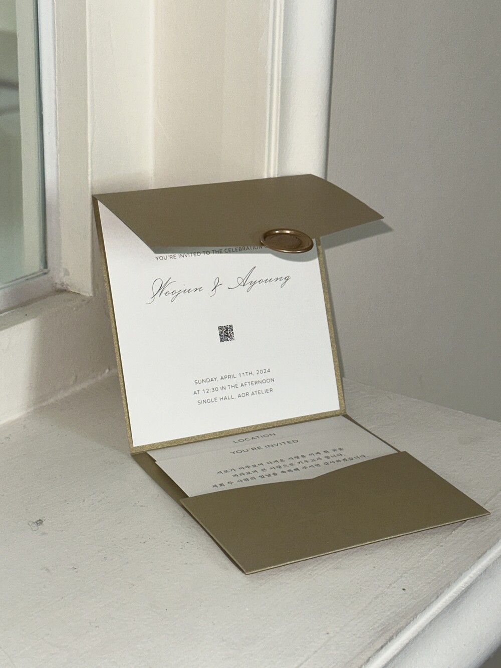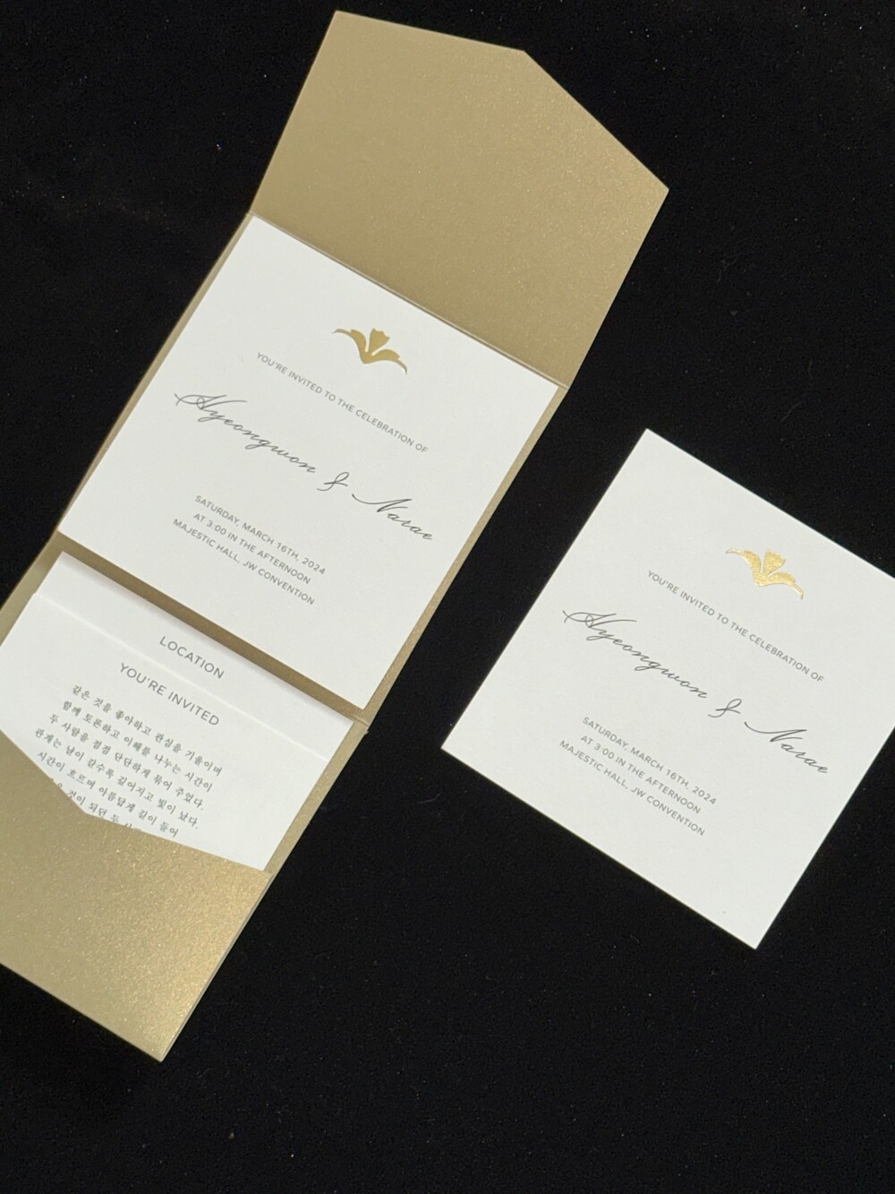 3. 특이사항 : 동일한 사이즈의 왁스실링 클래식 백합 골드로 변경 가능하며, 트라이폴드 형태의 청첩장으로 별도 봉투는 제공되지 않습니다.